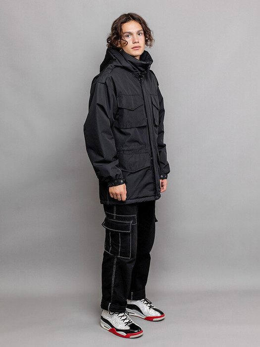 Куртка-парка Флойд черная для мальчика из плотной фактурной ткани мембрана. Центральная молния скрыта цельнокроенной ветрозащитной планкой с кнопками. Высокий воротник застегивается на две декоративные кнопки. Нагрудные объемные накладные карманы с клапаном на кнопке. Удобные нижние карманы с клапаном на магните. Спинка с вставками по пройме для регулировки объема, с фигурным удлиненным низом и кулисой со шнуром. Капюшон съемный на молнии и регулировкой по внутреннему лицевому краю. Внутренняя кулиса со шнуром для регулировки ширины талии. Рукав объемный с эластичной манжетой и патой на кнопке для регулировки ширины.  Особенности: Пропитка материала DWRРегулировка объёма рукава Регулировка объёма куртки по талии и низу Съёмный капюшон Регулировка объёма капюшона Спущенная линия плеча с погоном на кнопке  Характеристики:Ткань верха: мембранаПодклад: таффета Утеплитель: 100 гр/м2Температурный режим от +5°С до -10°СПроизводитель: batik