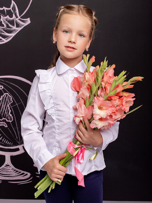 Блузка для девочки белая с длинными рукавами и декоративными оборками. Застежка на петли пуговицы. Креативный стильный дизайн сделает однотонную блузку модной деталью гардероба любой девочки.Характеристики:Ткань: Сорочечная ткань хлопок 97% спандекс 3%Производитель: Batik