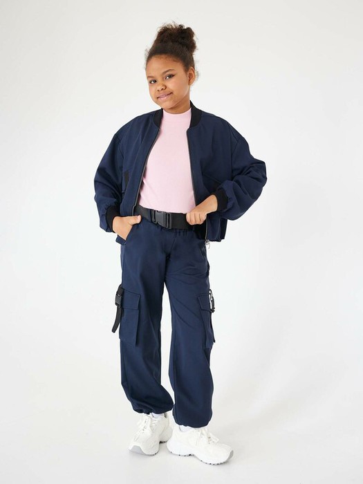 Брюки-карго темно-синие для девочки являются абсолютным трендом этого сезона. Широкие брюки с двумя накладными карманами по бокам и боковыми карманами. Модель с высокой посадкой и завышенной талией подчеркнет фигуру и добавит уверенности. Идеальный вариант для школьниц, предпочитающих нестандартную школьную форму. Модный ремень-стропа. Отлично смотрится как костюм вместе с укороченным бомбером Зарина.Характеристики:Ткань: