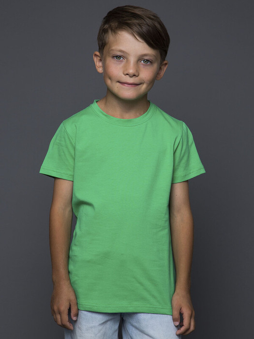 Яркая детская футболка зеленого цвета с коротким рукавом.