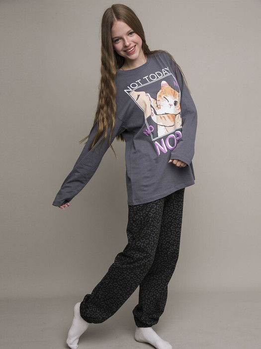 Детский пижамный комплект для девочки из супрема пенье. Футболка серая с длинным рукавом и милым принтом в виде котика и надписями. Брюки черные со стильным леопардовым принтом. Эластичная резинка на брюках для комфортного сна.Характеристики:Ткань: Супрем пенье 100% хлопокПроизводитель: batik
