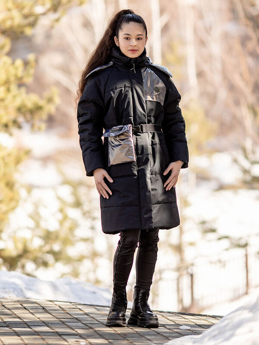 Пальто стеганое Сицилия зимнее для девочек из переливающейся ткани на молнии и планке с кнопками. Рукава реглан, на талии эластичный пояс с фастексом, по бокам карманы с листочкой, на спинке настрочная центральная деталь, по переду отлетная кокетка. Высокий теплый воротник, съемный капюшон на кнопках, съемная опушка. Пальто декорировано термотрансферами, нашивками и поясной сумкой.