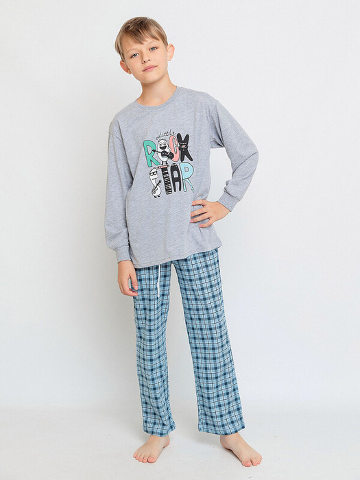 Пижама для мальчика трикотажная из супрема: футболка с длинным рукавом и брюки. Детская пижама сшита из 100% натурального гипоаллергенного хлопка. Пижама подойдет для сна дома и в детском саду, а также можно носить как домашний костюм. Футболка серая с принтом в виде надписей и прямые брюки в клетку на завязках.Характеристики:Материал: Супрем пенье 100% хлопокПроизводитель: batik