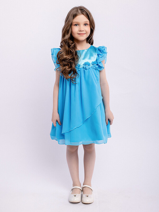 Нарядное платье с завышеной талией из шифона с рукавами рюшами. Подкладка 100% хлопок. Голубое платье с короткими рукавами. Лиф атласный блестящий, завышенная талия. На спинке имеется поясок, чтобы дополнительно утянуть талию. Аппликации в виде объемных цветов. Юбка многослойная с асимметричными слоями.Особенности модели: На спинке имеется поясок чтобы дополнительно утянуть талию Юбка многослойнаяХарактеристики:Размеры (рост): 92-116Ткань верха: Сатин - Полиэстер Сетка - ПолиэстерПодкладка 100% хлопокПроизводитель: batik