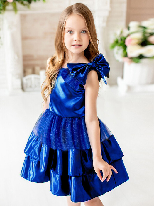 Нарядное платье синего цвета с пышной юбкой, декоративным бантом на плече. Яркое атласное платье с коротким рукавом и пышным подъюбником. Подклад хлопок 100%.Особенности модели:На спинке имеется поясок чтобы дополнительно утянуть талиюСиний цветЮбка многослойнаяХарактеристики:Размеры (рост): 98-134Ткань верха: Сатин - ПолиэстерСетка - ПолиэстерПодкладка 100% хлопокПроизводитель: batik