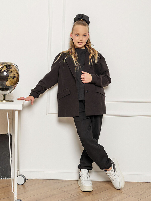 Жакет для девочки черный оверсайз однобортный удлиненный. Из трикотажного полотна на подкладе  прямого кроя. Два кармана с клапаном, костюмный воротник. Рукав с манжетом.Характеристики:Ткань: Хлопок 60%,