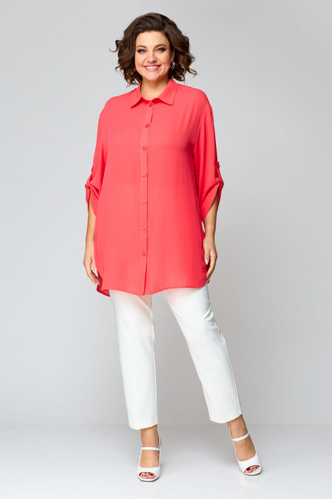 Блузка прямого силуэта, длиной ниже бедер, выполнена из однотонной ткани. Полочка с застежкой на петли и пуговицы, по правой нижней части декор в виде принта. Спинка с отрезной кокеткой, но которой выполнен декор в виде принта. Воротник рубашечного типа, стояче-отложной. Низ блузки ассиметричный, по побоковым швам обработана застежка. Пройма углубленной формы, рукав рубашечного типа, длиной 7/8 по низу с патами.