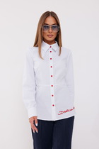 Блузон длины макси выполнен из ткани молочного цвета. Силуэт свободный. Бретели регулируемые. Лиф отрезной фигурный, двойной, по бокам выточки. Без подкладки. Застёгивается от груди на ряд пуговиц. Длина по спинке 112 см
