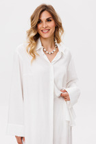 Блузка свободного кроя, выполнена из легкого натурального полотна с вышивкой молочного цвета. Характеристика: прямой свободный крой, V-образный вырез, рукав широкий вточной, низ присборен на фигурную узкую манжету, лиф отрезной по линии талии, застежка центральная на шнурки-завязки. Длина по спинке 64 см, длина рукава от края горловины 68 см.