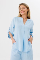 Блузка свободного кроя. Выполнена из мягкого полупрозрачного полотна белого цвета. Вырез горловины V-образный, с воланом по всей длине (переходит на спинку). Рукав втачной, свободный, по низу нашит волан. Низ блузы по переду фигурный с воланом, волан переходит на спинку. Спинка удлиненная. Застёжка центральная на петли-пуговицы . Длина рукава от линии втачивания 57 см. Длина спинки 76 см.