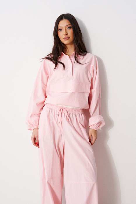 Блузон прямого свободного кроя выполнен из хлопковой ткани, в коралловом оттенке. Характеристики: отложной воротник, застежка центральная на петли пуговицы, по переду имитация кармана. Низ изделия на резинке с фиксатором. Плечо спущено, рукав свободный, низ рукава на резинке. Длина по спинке 58 см, длина рукава от края горловины 83 см.