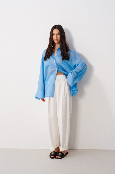 Рубашка свободного кроя. Выполнена из мягкой невесомой прозрачной ткани голубого цвета. Воротник отложной. Рукав втачной, спущенный, с манжетой с пуговкой. На уровне линии груди накладные карманы. Спинка отрезная с кокеткой. По центру спинки вертикальная кулиска с регулируемой сборкой. В боковых швах разрезы 20 см. Застёжка центральная пуговицы. Длина спинки 71 см. Длина рукава от линии втачивания 50 см.