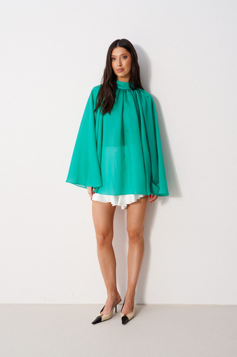 Блузка свободного кроя, выполнена из полупрозрачного полотна зеленого цвета. Характеристика : свободный крой, воротник стойка сзади на застежке петли пуговицы. Рукав-реглан. Длина рукава от горловины 75см, длина по спинке 74см