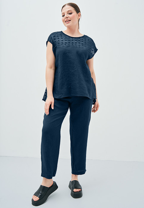 Летний сезон диктует свои требования к женской одежде - максимальная легкость, простота кроя, удобство в ношении. Лен отвечает этим требованиям на сто процентов. А в сочетании с хлопковым кружевом получается отличная блузка для жарких дней. Блузка свободного силуэта, с центральной застежкой на спинке на петли и пуговицы. Горловина круглой формы, рукав короткий, спущенный. Возможно отличие фотографии по оттенку, связанное с разной цветопередачей монитора.