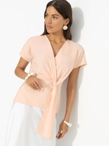 Блузка прямого силуэта, из шифоновой ткани в горох. Блузка с круглым вырезом горловины и широкой планкой на которой расположена, декоративные бусины, в блузке боковые швы переходят на деталь переда и заканчиваются разрезами, с не большим перепадом длины. Спинка на широкой обтачке. Рукава полуреглан, расширенные, низ на резинке, длина 3/4. Блузка на подкладке. С помощью блузки можно создавать интересные образы на каждый день. Длина блузки - 70 см
