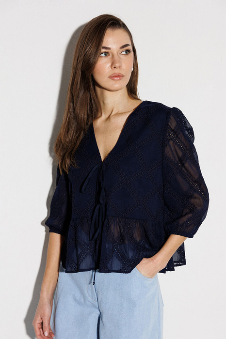Блузка с V-образным вырезом и втачным рукавом 3/4 со сборкой по окату и внизу на резинке. Полочка с центральной застежкой на завязки. По полочке и спинке по линии талии вставлен волан со сборкой и фигурным низом. Блузка на подкладке из хлопка.