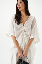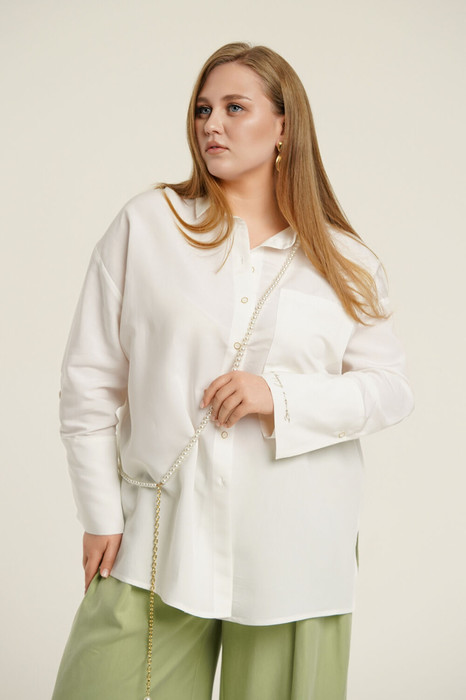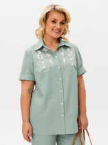Блуза женская свободного прямого кроя. Воротник рубашечный, застежка на петли и пуговицы. Рукав отрезной на базе цельнокроеного, длинный с широкой манжетой. На левой манжете декоративная вышивка. По переду имитация накладного кармана. По спинке кокетка с бантовой складкой и декоративной патой. В боковых швах разрезы.