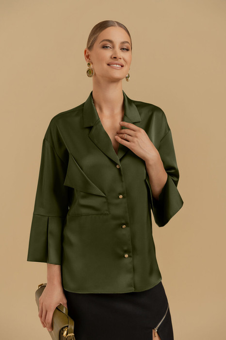 Блузка женская свободного силуэта из атласной ткани. Вырез горловины оформлен воротником пиджачного типа с застежкой на петли с пуговицами. Рукава- отрезные на базе цельнокроеных с отрезными манжетами с разрезами. В боковых швах выполнены разрезы. Передняя половинка декорирована настрочным декоративным элементом.