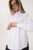 Блузка женская прямого силуэта выполнена из легкой ткани платьево-костюмного ассортимента. Борт обработан супатной застежкой. Полуворотник на стойке. Спинка обработана двойной кокеткой с V-образным вырезом, по верхнему срезу спинки заложена бантовая складка. На уровне стойки вставлена цепочка. Плечо спущенное, рукав прямой. По низу рукава заложены складки, разрез окантован. Манжет рукава застегивается на две петли и пуговицы.