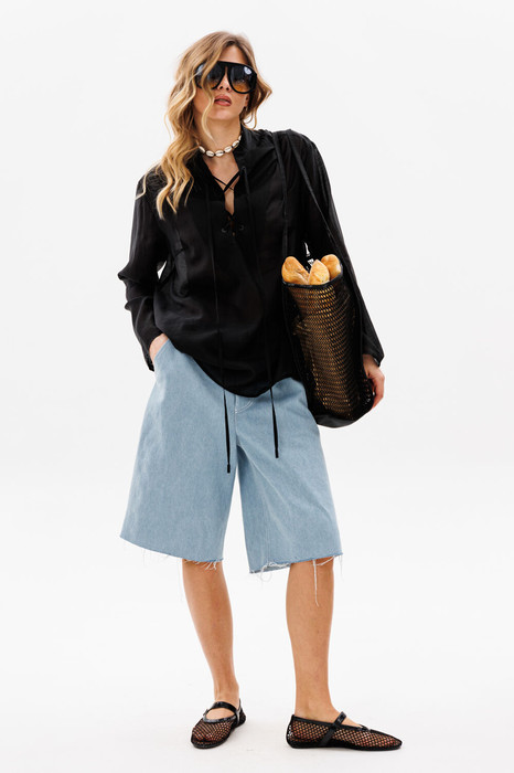 Блузка выполнена из плательно-блузочной ткани. Блузка женская прямого силуэта, длиной до линии бедер. Перед и спинка цельные. Спереди нагрудные вытачки и прорезь по центру. Горловина - воротник-стойка. Плечевой шов удлинен. Рукав рубашечного покроя одношовный. Блузка декорирована люверсами спереди и тесьмой-шнуром из основной ткани.