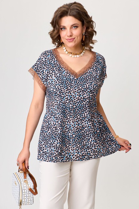 Блузка женская РУЖАНА изготовлена из легкой текстильной ткани (искусственный шелк). Блузка полуприлегающего силуэта со спущенным рукавом, по полочке и спинке рельефы, по талии подрезы со сборкой. По горловине блузки нашито тонкое кружево, низ рукава обработан кружевом. Низ изделия обработан швом в подгибку.