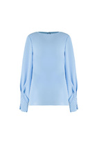 Блузка свободного силуэта из струящейся шифоновой ткани. Перед и спинка с кокеткой и сборкой. Рукав спущенный свободный с резинкой понизу. Вдоль линии кокетки и рукава вставлена рюша. Горловина V-образной формы с воротником стойкой переходящей в бант. Длина блузки - 67 см, длина рукава - 60 см.