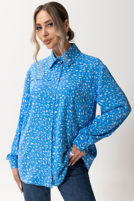 Блузка, с центральной застежкой на петли и пуговицы по планке переда, с втачным воротником с отрезной стойкой. По полочкам на уровне груди односторонняя складка. По спинке от горловины расположены две односторонние частично стачные складки. Линия низа фигурная. Рукав втачной, длинный, с отрезной манжетой. Манжета застегивается на две петли и пуговицы.