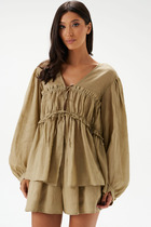 Блузка женская прямая с центральной потайной застежкой на петли и пуговицы. Перед с отстрочными рельефами, в которых вставлен декоративный элемент в виде планки из основной ткани. Спинка цельнокроеная. В боковых швах обработаны разрезы. Низ ассиметричный, перед короче спинки. Пройма углублена и слегка спущена. Рукав типа «летучая мышь» с функциональной застежкой по всей длине рукава со стороны спинки на петли и декоративные пуговицы. Низ рукава присборен и обработан притачной манжетой, застегивающейся на петлю и пуговицу. По горловине воротник рубашечного типа с отрезной стойкой. Декоративные элементы и фурнитура могут отличаться от заявленных на фото. Цвет материала может отличаться по тону в зависимости от настроек вашего монитора!