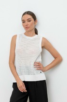 В плечевых и боковых швах детали верхнего изделия закреплены. Горловина спинки и переда майки имеют округлые глубокие вырезы. Верхние детали майки короче основного изделия на 6-7 см. Длина изделия по спинке 48 см.