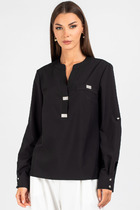 Блуза из тонкой ткани с атласным эффектом, свободного силуэта с V-образным вырезом. Это довольно глубокий вырез, который прекрасно подчёркивает декольте и линию шеи. Застежка на навесные петли и пуговицы. Рукава длинные объёмные втачные заканчиваются широкой манжетой с застёжкой на навесные петли с пуговицами.