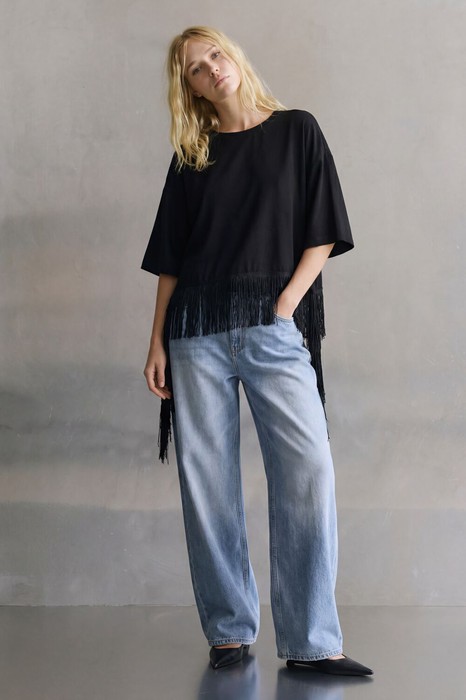 Блуза свободного кроя выполнена из трикотажного полотна, линия плеча спущена, рукав кроткий, округлый вырез горловины обработан бейкой, по переду к низу пришита бахрома с отлетными концами.