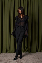 Нарядная блузка из атласной ткани. На полочке складки, небольшой V-образный вырез и декоративная стойка. Спинка со средним швом и застежкой на молнию. В боковых швах по низу разрезы