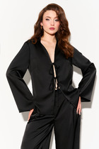 Стильная блузка прямого силуэта из плотного креп-шифона. Изделие с центральной планкой на застежку петли пуговицы по полочке и воланами вдоль планки. ГорловинаV-образной формы. Рукав втачной с центральным швом и воланом по низу и со сборкой на эластичную ленту в 8см от края рукава. Спинка изделия цельная.