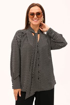 Блузка женская c рубашечным воротником, свободного силуэта. Полочка и спинка изделия, горизонтально разрезные на косую. Верхняя часть полочки с нагрудными вытачками, накладным карманом на левой части и цельнокроеной планкой на застежку. Рукав прямой, втачной с широкой манжетой на отворот. Низ изделия фигурный с разрезами по боковым швам, обработан широкой обтачкой.