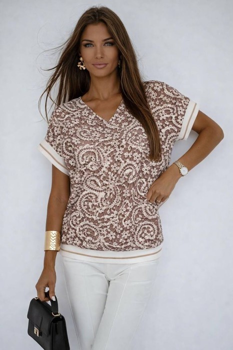 Основные особенности блузки: короткий рукав с манжетой со спущенной линией плеча, V-образная горловина , зрительно вытягивает шею, резинка по низу блузки. Свободный крой способствует хорошей посадке и подходит и стройным и полным девушкам.