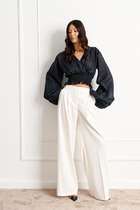 Блуза свободного кроя с округлым вырезом горловины. Центральная застёжка на петли и пуговицы. Рукав втачной одношовный спущенный с притачной манжетой на петлю и пуговицу. Спинка с отрезной кокеткой, нижняя часть спинки декорирована плиссированным шифоном. Низ изделия фигурный. Боковые швы с разрезами.
