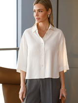 Блуза свободного прямого кроя прямого силуэта с V-образным вырезом. Воротник стояче-отложной рубашечного типа, застёгивается на пуговицу и петлю. Рукава объёмные, собраны на резинку. В боковых швах и по переду разрезы.