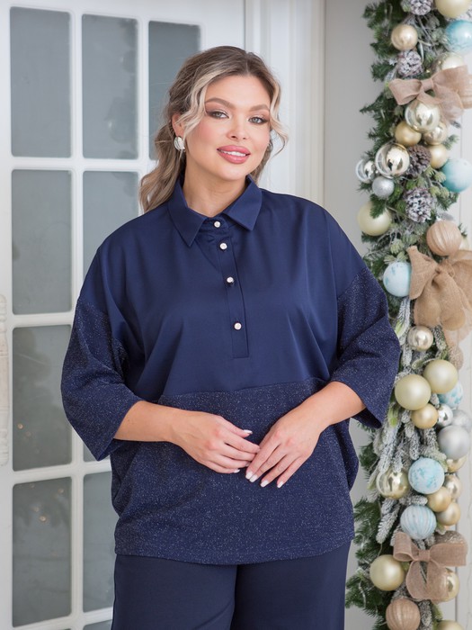Нарядная блузка свободного силуэта, выполнена в сочетании 2-х видов ткани. Блузка с отрезным низом по переду и спинке. Верхняя часть переда с центральной застежкой на петли и пуговицы. Спинка со средним швом. Нижняя часть переда и спинки целая. По горловине втачной отложной воротник на цельнокроеной стойке. Блузка с удлиненной линией плеча и свободной заниженной проймой. Рукав втачной, длиной 3/4. Длина рукава от горловины в 50 р-ре – 53 см. в 64 р-ре – 60 см., ширина рукава по низу в 50 р-ре – 30 см. в 64 р-ре – 36 см.В В Нижняя часть блузки и рукава выполнены из трикотажного полотна с люрексом. Верхняя часть блузки из эластичной шелковистой ткани-компаньона. Блузка без подклада. Длина изделия по спинке в 50 р-ре – 68 см. в 64 р-ре – 76 см.