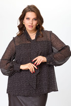 Детали: блуза приталенного силуэта, перед и спинка свободного покроя, пояс блузы со сборкой, расширенные плечи, сборки по плечам и горловине, застёжка на потайную молнию в боковом шве, воротник стойка со сборкой и застёжкой на навесные петли и пуговицы, втачные расширенные к низу рукава с резинкой по низу.