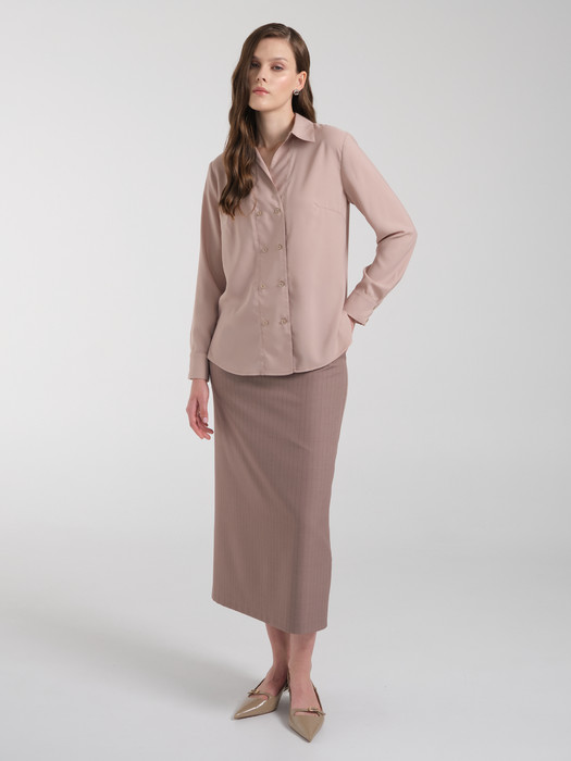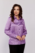 Модель полуприлегающего силуэта. Спереди широкая планка с двубортной застёжкой на петли и пуговицы. Спинка с кокеткой, под кокеткой складка. Воротник сорочечный. По низу рукава разрез, защип и манжета с застёжкой на пуговицы. Низ блузки закуглён. В боковых швах разрезы.
