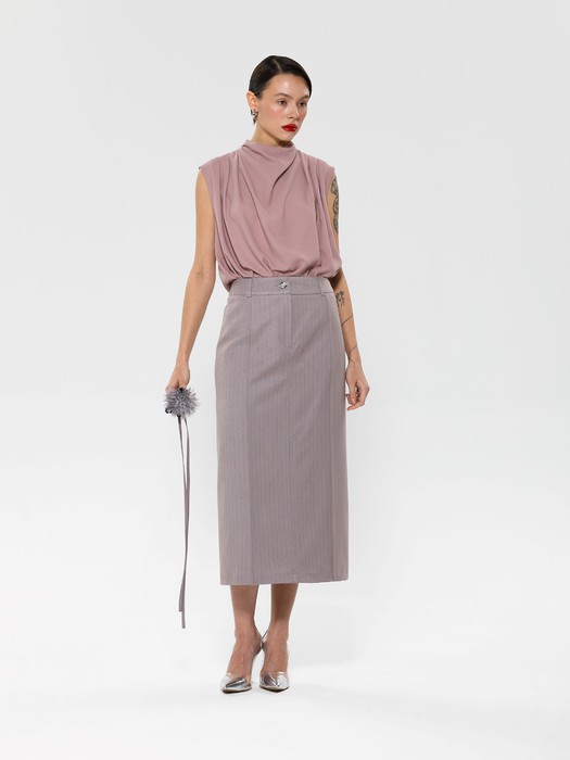 Модель прямого силуэта, без рукавов. В среднем шве спинки потайная застёжка молния. По плечевым швам спереди и сзади заложены складки. Воротник комбинированный, сзади стойка, спереди качели.