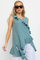 Блузка прямого силуэта с втачным рукавом. Горловина округлая с планкой по переду. Рукав длинный, по низу со сборкой и притачной манжетой с застежкой на петлю и пуговицу. Рукав и нижняя деталь спинки из сетки. Низ блузки асимметричный, спинка длиннее переда. Планка по горловине, низу переда и манжеты выполнены из отделочного материала.