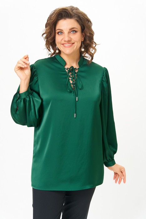Блузка женская прямого кроя, с втачным рукавом. Горловина v- образной формы с воротником стойкой декорирована контрастной шнуровкой. Спинка цельная. Рукав длинный со сборкой по окату, низ рукава присобран на притачную манжету с застежкой на петлю и пуговицу. В боковых швах обработаны разрезы.