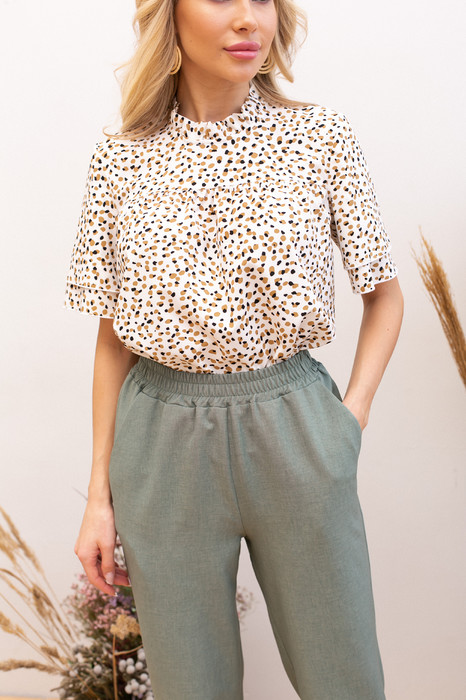 Изящная блуза прямого силуэта из легкой ткани Ниагара. Воротник сверху оформлен оборкой. По спинке выполнена застежка на петлю и пуговицу. Втачные рукава с двойной сборкой разной длины. Низ ровный, без разрезов. Блуза добавит Вашему образу шарма и женственности.