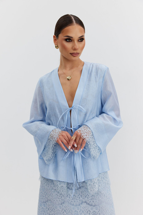 Блузка женская свободного силуэта, из полупрозрачной вуали. Спинка и перед на кружевной подкладке. Застежка на планку с тремя завязками. Рукав втачной длинный расширенный книзу, по низу рукава кружевная широкая манжета, имитирующая многослойность.