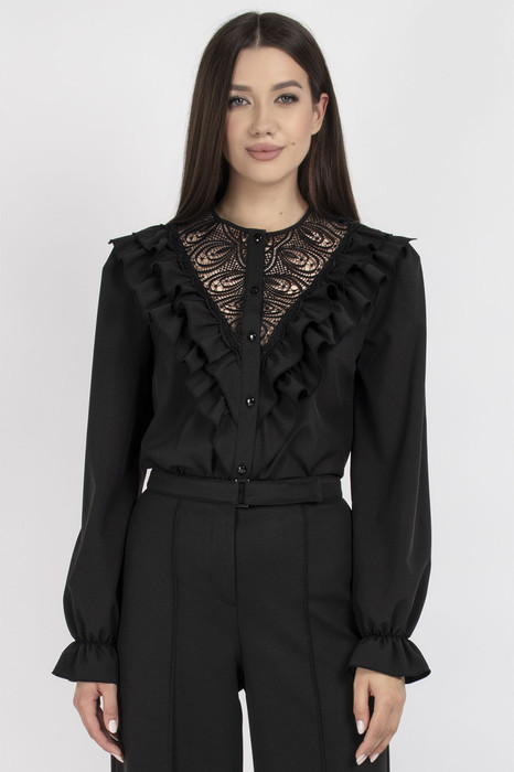 Визитная карточка этой блузки - это ее перед, украшенный двойными рюшами, а также кокетка выполненной из ажурного кружева. Именно благодаря этому отделочному элементу блузка приобретает особую элегантность и изысканность, становясь непременным атрибутом нарядного образа.
