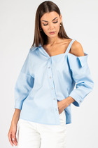 Блузка с короткими рукавами. Сзади - застежка в виде змейки. Спереди посередине модель украшена вертикальной планкой с интересным рисунком. Длина изделия - 61 см.