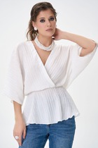 Блуза женская из гладкокрашеного тканого штапельного полотна, прямого силуэта, с горловиной овальной формы и цельнокроеными рукавами. Горловина окантована основным материалом, в боковых швах разрезы.