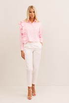 Блузка-рубашка женская из штапельного полотна с набивным рисунком «полоска», свободного кроя, удлиненная, со стояче-отложным воротником, спущенным длинным рукавом. Перед из двух частей с центральной бортовой застежкой на петли и пуговицы, спинка цельнокроеная. Низ рукава с притачной манжетой, застегивающейся на петлю и пуговицу.
