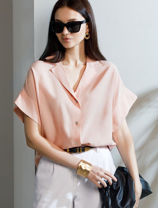 Состав: 55%Вис 45%Лиоцелл (Вис) Плотность: 115 Г/м2Блузка пудрового цвета сочетает в себе комфорт и элегантность благодаря материалу из вискозы с лиоцеллом. Аккуратный отложной воротник подчеркивает утонченность образа, а широкие короткие рукава привлекают внимание и делают силуэт современным. Спущенная линия плеча формирует расслабленный, но стильный внешний вид, что идеально для тех, кто ценит индивидуальность и уверенность в деталях. Крой продуман так, чтобы подчеркивать достоинства фигуры и на больших размерах, создавая гармоничный силуэт без лишних усилий. Ткань из вискозы с добавлением лиоцелла обеспечивает приятные ощущения и отличную посадку, струится на теле и охлаждает в жаркую погоду. При пошиве использована технология «чистый край» по всей длине центральной планки и низу изделия. Это признак премиум качества — «чистый край» вместо оверлока. Блузку можно носить с топом, не застегивая — при этом распахнутая блузка будет выглядеть максимально эстетично. Рубашка легко впишется как в деловой гардероб, так и в повседневный стиль, позволяя выглядеть безупречно независимо от ситуации.